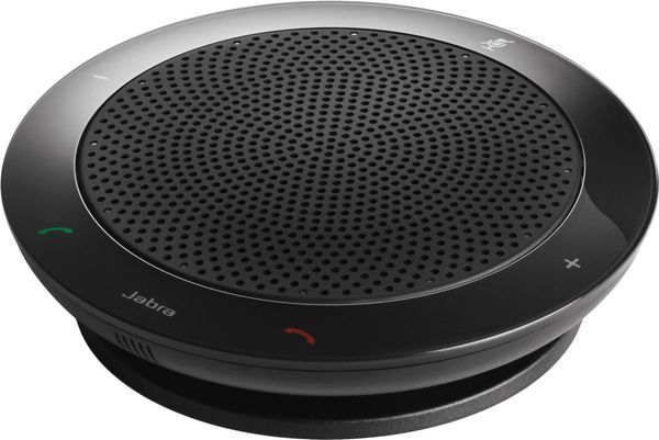 Le haut-parleur microphone Jabra Speak 410 est un modèle d'ergonomie, avec ses touches tactiles disséminés à la circonférence de son cache haut-parleur.