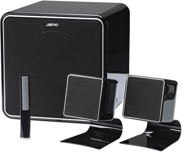 L'ensemble 2.1 Jamo P102 est composé de deux satellites compacts montés sur un large pied et d'un caisson de basses compact. L'amplification intégrée est généreuse, avec pas moins de 100 watts au total, dont 60 W pour le caisson. Malgré leur petite taille, les enceintes satellites sont équipées de haut-parleurs à 2 voies coaxiaux et délivrent ainsi un son précis. Le caisson embarque quant à lui un haut-parleur de 16,5 cm de diamètre capable de produire du grave jusqu'à 42 Hz, ce qui assure une belle profondeur à la scène sonore. La connectique est complète, avec des entrées analogiques et numériques, pour connecter les sources les plus récentes (smartphones, lecteurs réseau ou Blu-ray par exemple). L'ensemble Jamo P102 est livré avec une télécommande RF pour faciliter son utilisation même lorsque le caisson est considérablement dissimulé.