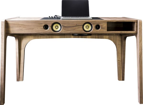Côté design, le bureau enceinte multimédia La Boite Concept LD Studio bénéficie d'une ébénisterie en noyer naturel mat et sa face supérieure dispose d'un sous main en cuir noir. On retrouve également un tiroir de rangement sur la face supérieure avec un présentoir permettant de poser des documents et un emplacement de rangement sur la face avant. On notera également la présence d'une trappe de 30 cm sur le dessus du bureau. Cette dernière intègre une prise électrique 220 V afin de connecter de façon discrète un ordinateur, un smartphone ou une tablette par exemple.