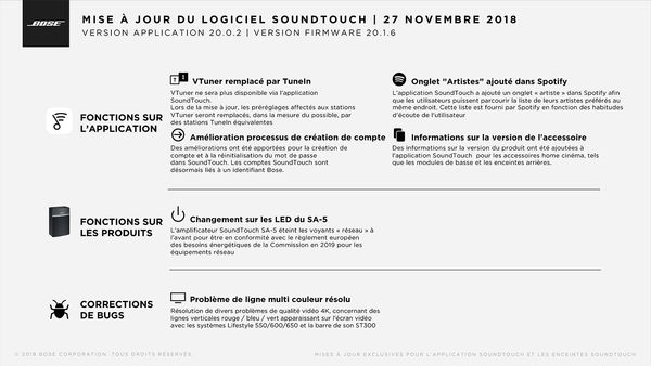 Le système audio sans fil SoundTouch® 10 est une enceinte sans fil compacte destinée à être utilisée à la maison. Dotée du Bluetooth et du WiFi elle offre une grande simplicité d'usage. Elle permet de créer un système multiroom Bose SoundTouch, d'accéder aux services de musique comme Spotify et Deezer, ainsi que la lecture de fichiers disponibles en réseau via le protocole DLNA.