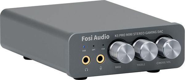 Pensé pour s’intégrer facilement dans un setup gaming ou hi-fi, le K5 Pro dispose d’entrées USB-C, optique et coaxiale pour s’adapter à différentes sources. Une sortie RCA permet de relier un amplificateur ou des enceintes actives, tandis que la façade accueille une sortie casque jack 3,5 mm ainsi qu’une entrée micro indépendante, idéale pour les communications en jeu ou les visioconférences.