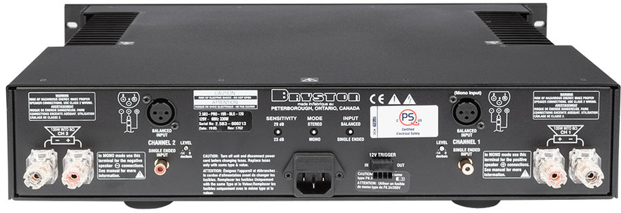 L'amplificateur de puissance Bryston 2.5B³ s'associe facilement à tout pré-amplificateur grâce à sa double entrée : une première asymétrique RCA et une seconde symétrique XLR. Les borniers d'enceintes profitent d'une conception haut de gamme pour assurer un contact optimal avec les câbles. Ils sont compatibles avec les câbles de forte section, les fourches et les fiches bananes. Pour assurer une adaptation optimale à votre matériel, l'ampli de puissance Bryston 2.5B³ dispose d'un gain ajustable : 29 dB ou 23 dB. Enfin, des sorties et entrées Trigger permettent de l'allumer automatiquement en même temps que vos sources ou que votre pré-amplificateur.