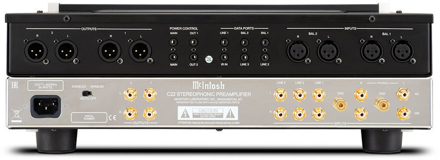 Le pré-amplificateur McIntosh C22 MK V bénéficie d'une connectique complète pour y associer de nombreuses sources.