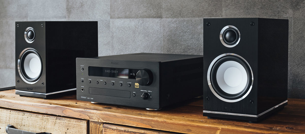 Cette chaîne hi-fi Magnat comprend l'ampli-CD Magnat MC 100 et la paire d'enceintes compactes Magnat Quantum Edelstein.