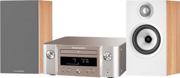 La chaîne composée Marantz/B&W comprend l'ampli hi-fi stéréo Marantz Melody X M-CR612 ainsi que la paire d'enceintes bibliothèque B&W 607 S2 Édition 25e Anniversaire.