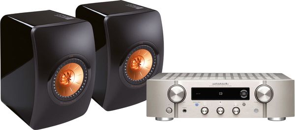 La chaîne hi-fi composée Marantz / KEF comprend l'amplificateur haute-fidélité PM7000N ainsi qu'une paire d'enceintes bibliothèque KEF LS50.
