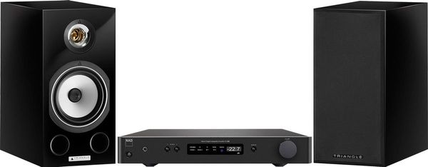 La chaîne NAD C338 / Triangle Comete EZ comprend l'ampli stéréo avec DAC intégré NAD C338 et la paire d'enceintes compactes Triangle Comete EZ.