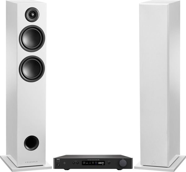La chaîne NAD C338 / Triangle LN05 comprend l'ampli stéréo avec DAC intégré NAD C338 et la paire d'enceintes colonne Triangle Elara LN05.