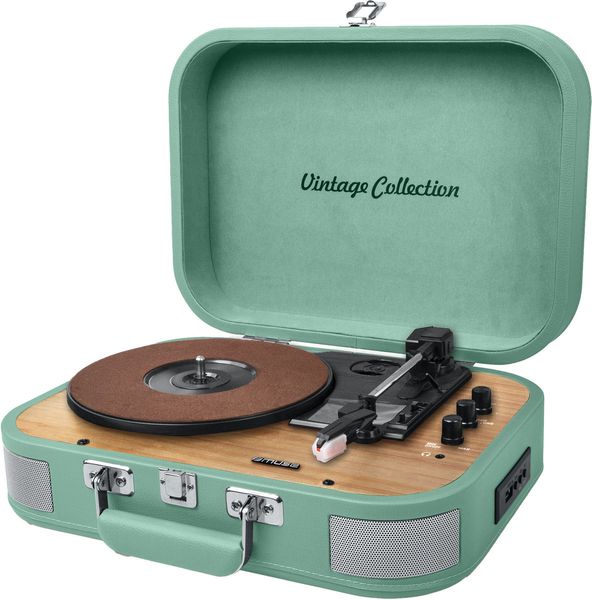 Magnifique cadeau que nous avons fait. Très belle platine type Vintage mais avec toutes les fonctionnalités modernes. En revanche ne vous attendez pas à un son extraordinaire sur les 2 petits HP en façade. Mais ça reste une tres belle platine, fonctionnelle et design. En plus se ferme comme une mini valise. La platine en blanc est vraiment tres belle.