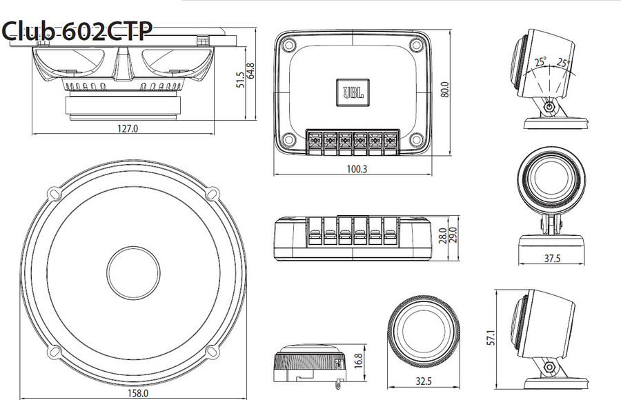 Le kit éclaté voiture JBL Club 602CTP comprend deux supports amovibles dédiés aux tweeters. Ils sont inclinables à plus ou moins 25 degrés afin de vous garantir le meilleur angle d'écoute dans votre véhicule.