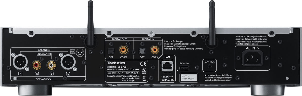 En matière de connectique, le lecteur CD et lecteur réseau Technics SL-G700E met à disposition deux sorties numériques (une optique et une coaxiale), ainsi que deux sorties analogiques (une sortie asymétrique RCA et une sortie symétrique XLR). Il peut ainsi facilement être associé à tout amplificateur ou DAC externe. Pratique, le circuit de conversion haute performance du lecteur Technics SL-G700E peut également être mis à profit pour convertir le signal d'une source externe grâce à deux entrées numériques (une optique et une coaxiale).