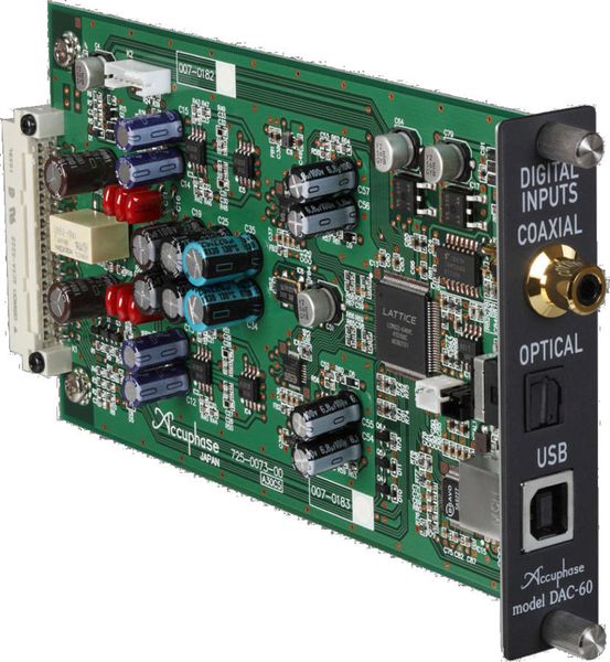 Le module Accuphase DAC-60 est un convertisseur numérique vers analogique destiné à être inséré directement dans les préamplificateurs et les amplificateurs intégrés Accuphase dotés d'un emplacement compatible. Sont notamment concernés les amplis hi-fi Accuphase E280, Accuphase E380 et Accuphase E480.