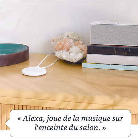 Version minimal des DOT, elle écoute, exécute, mais ne cause pas. Dispositif Alexa discret à connecter à votre dispositif audio par liaison Bluetooth ou connectique jack 3,5. Installation très facile.