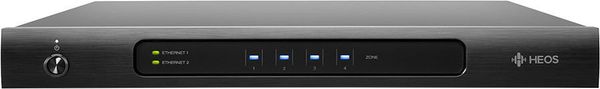 Compatible avec des solutions de contrôle tierces comme Control4, Crestron, RTI, URC et ELAN, le Denon HEOS SuperLink est conçu pour s'intégrer facilement à la majorité des environnements home audio de qualité professionnelle. Chaque zone gérée par le Denon HEOS SuperLink dispose d'une sortie stéréo RCA pré-amplifiée, d'une sortie audio numérique optique et d'une sortie audio numérique coaxiale. La connectique comprend également 4 entrées ligne RCA (1 par zone) ainsi que 2 entrées numériques optiques et 2 entrées numériques coaxiales assignables auxquelles s'ajoutent un port USB pour chaque zone, destiné à la connexion d'une clé USB externe pouvant contenir des fichiers audio de qualité standard ou HD (jusqu'en 24 bits / 192 kHz). Enfin, le double port réseau Ethernet (RJ-45) assure la connexion au réseau local et le partage de la connexion Internet avec d'autres périphériques.