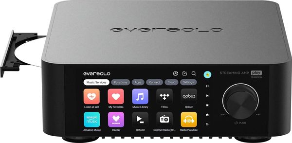 L'ampli stéréo EverSolo Play est un modèle connecté capable de développer une puissance de 60 W RMS sous 8 ohms et de 110 W sous 4 ohms. Équipé du même écosystème que les célèbres lecteurs réseau de la marque, il peut accéder à de nombreux services de streaming comme Qobuz, Tidal, Amazon Music ou Spotify et recevoir de la musique en DLNA, Bluetooth ou via Roon. Son DAC AKM assure la prise en charge des fichiers Hi-Res jusqu'à 32 bits / 768 kHz et une lecture native du DSD512. La connectique complète permet d'y associer de nombreuses sources analogiques et numériques, dont un téléviseur en HDMI ARC ou une platine vinyle. La version EverSolo Play CD Edition intègre même un lecteur CD pour lire et copier les disques.