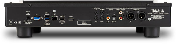 Coté son, le serveur audio McIntosh MS500 propose des sorties analogiques symétriques XLR et asymétriques RCA. Il embarque aussi des sorties numériques optique Toslink et coaxiale, ce qui augmente encore la variété de branchement possible à un système Hi-Fi.