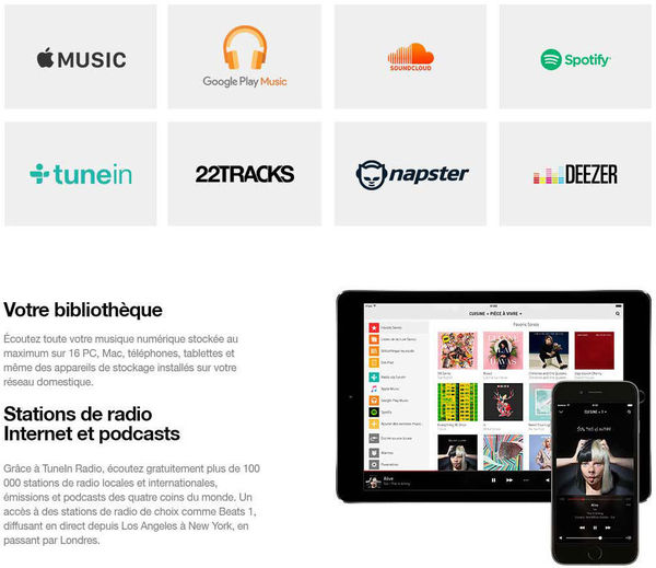 C'est en effet toute la "magie" de cette barre de son Sonos Playbase : elle s'appuie sur la puissance et la simplicité de mise en œuvre du réseau Sonos Net développé par la firme californienne pour établir un réseau maillé entre chacun des produits de la marque. Connectez la Sonos Playbase à votre box ADSL au moyen d'un câble réseau Ethernet et liez ensuite tous les lecteurs Sonos sans fil en une seule étape. Cela vous permet donc de vous constituer facilement une chaîne home-cinéma 5.1 sans fil, mais cela vous offre également la possibilité d'accéder avec la Sonos Playbase à toute vos musiques partagées sur le réseau, qu'elles soient stockées sur PC, sur Mac ou sur un NAS. Enfin, l'application de contrôle gratuite disponible sous iOS et Android vous permet non seulement de piloter la lecture de vos fichiers audio sur la Sonos Playbase et sur tous les autres appareils Sonos de votre réseau, mais vous donne également accès à des milliers de stations de radio Internet, aux podcasts et aux services de streaming de musique en ligne comme Apple Music, Deezer, Spotify, Qobuz... Tout cela, même lorsque votre TV est éteinte. Accédez à votre iTunes et à votre bibliothèque musicale personnelle. Écoutez Apple Music, fnac jukebox, Deezer, Spotify ou d'autres services de musique en ligne, ainsi que plus de 100 000 radios Internet du monde entier.