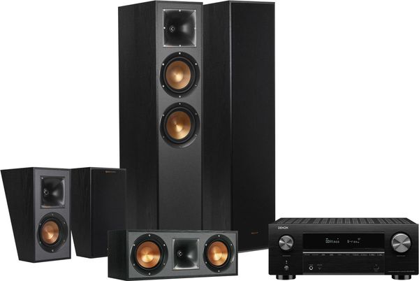La chaîne home-cinéma Denon AVC / Klipsch comprend l'ampli home-cinéma Denon AVC-X3700H et le pack d'enceintes Klipsch R-620F HCS 5.0 comprend une paire d'enceintes colonne Klipsch R-620F, une paire d'enceintes compactes Klipsch R-41SA et une enceinte voie centrale Klipsch R-52C.