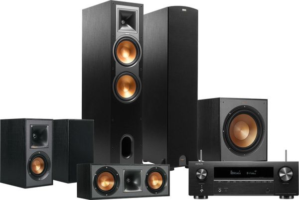 La chaîne home-cinéma Denon / Klipsch comprend l'ampli home-cinéma Denon AVR-X1700H DAB et le pack d'enceintes Klipsch R-28F HCM 5.1 comprenant la paire d'enceintes Klipsch R-28F, la paire d'enceintes compacte Klipsch R-41M, l'enceinte centrale Klipsch R-52C et le caisson de basses Klipsch R-120SW.