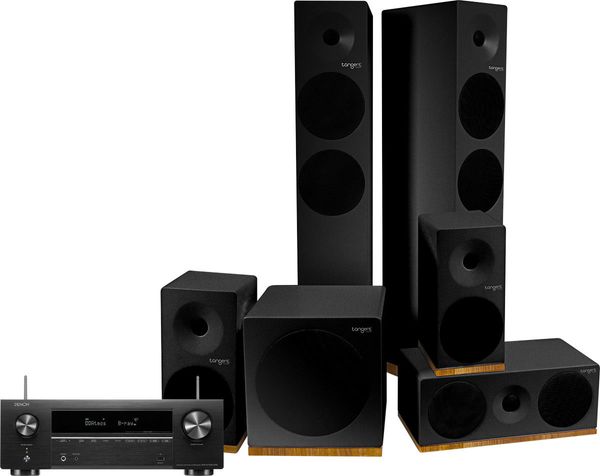 La chaîne home-cinéma Denon/Tangent comprend l'ampli home-cinéma Denon AVR-X1700H DAB ainsi que le pack d'enceintes Tangent Spectrum X6 HC 5.1 comprenant une paire d'enceintes colonne Tangent Spectrum X6, une enceinte centrale Tangent Spectrum XC, une paire d'enceintes compactes Tangent Spectrum X4, et un caisson de basses Tangent Spectrum XSW-8.
