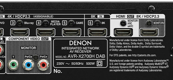 L'ampli home cinéma Denon AVR-X2700H DAB dispose de prises HDMI 2.1 compatibles 8K et prend en charge le Dolby Vision et le HDR10+.