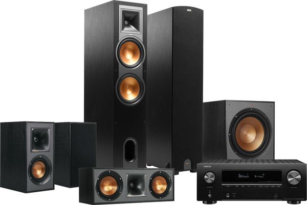 La chaîne home-cinéma Denon AVC / Klipsch comprend l'ampli home-cinéma Denon AVR-X2700H et le pack d'enceintes Klipsch R-28F HCM 5.1 comprenant la paire d'enceintes Klipsch R-28F, la paire d'enceintes compacte Klipsch R-41M l'enceinte centrale Klipsch R-52C et le caisson de basses Klipsch R-120SW.