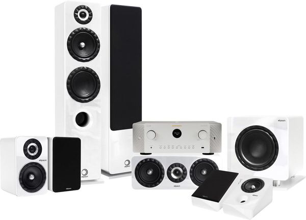 La chaîne grand spectacle Marantz/Elipson comprend l'ampli home-cinéma Marantz Cinema 60 DAB ainsi que le pack home-cinéma Elipson Prestige Facet HCM 14F 5.1 incluant la paire d'enceintes Elipson Prestige Facet 14F, l'enceinte centrale Elipson Prestige Facet 11C, la paire d'enceintes bibliothèque Elipson Prestige Facet 6B, le caisson de basses Elipson Prestige Facet Sub8 et la paire d'enceintes Atmos Elipson Prestige Facet 6 ATM.