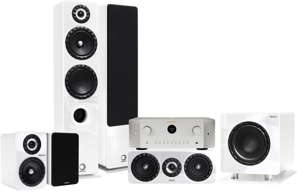 La chaîne grand spectacle Marantz/Elipson comprend l'ampli home-cinéma Marantz Cinema 60 DAB ainsi que le pack home-cinéma Elipson Prestige Facet HCM 14F 5.1 incluant la paire d'enceintes Elipson Prestige Facet 14F, l'enceinte centrale Elipson Prestige Facet 11C, la paire d'enceintes bibliothèque Elipson Prestige Facet 6B et le caisson de basses Elipson Prestige Facet Sub8.