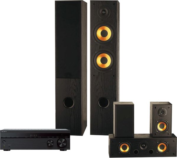 Ce système home-cinéma 5.0 comprend l'amplificateur home-cinéma 5.1 Sony STR-DH590, le pack d'enceintes Eltax Exposure 5.0 et 25 mètres de câble d'enceintes NorStone CL250 Classic.