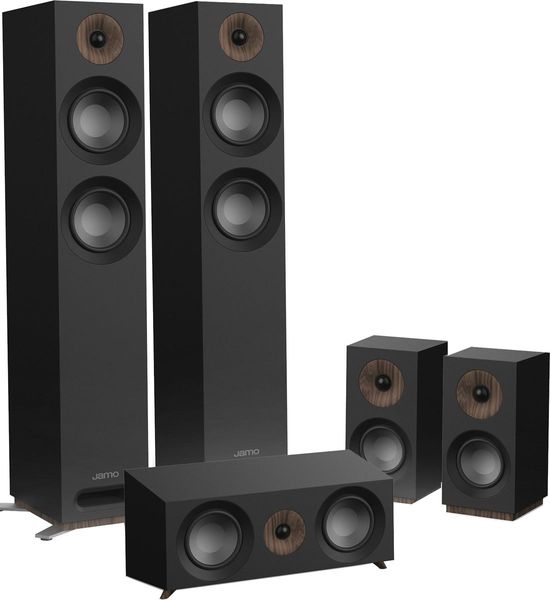 Le pack d'enceintes home-cinéma 5.0 Jamo 807 HCS comprend une paire d'enceintes colonne Jamo S 807, une paire d'enceintes compactes Jamo S801 utilisées comme enceintes surround et une enceinte centrale Jamo S 81 CEN.