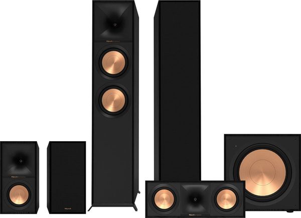 Le pack d'enceintes Klipsch 605FA 5.1.2 Édition 2022 comprend la paire d'enceintes colonne Klipsch R-605FA, la paire d'enceintes compactes Klipsch R-50M, l'enceinte centrale Klipsch R-50C et le caisson de basses Klipsch R-121SW.