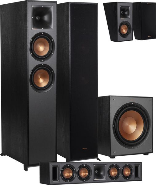 Le pack Klipsch R-625FA HCS 5.1.2 comprend 2 enceintes colonne Klipsch R-625FA, 2 enceintes compactes Klipsch R-41SA, une enceinte voie centrale Klipsch R-34C et un caisson de basses Klipsch R-120SW.