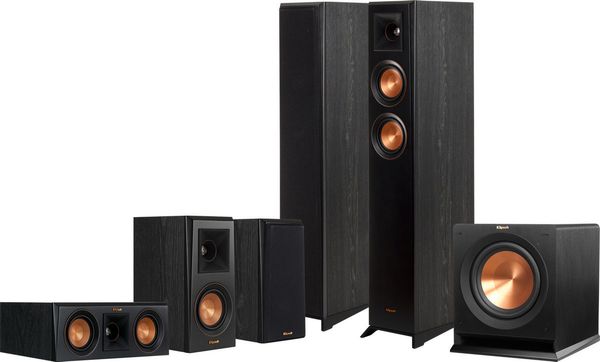 Le pack d'enceintes home-cinéma Klipsch Reference Premiere RP-4000F HCM 5.1 comprend la paire d'enceintes colonne Klipsch RP-4000F, la paire d'enceintes compactes Klipsch RP-400M utilisées comme enceintes surround, l'enceinte centrale Klipsch RP-400C et le caisson de basses Klipsch R-110 SW.