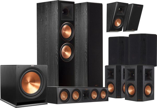 Le pack d'enceintes home-cinéma Klipsch Reference Premiere RP-8000F HCS 7.1.2 comprend la paire d'enceintes colonne Klipsch Référence Premiere RP-8000F, deux paires d'enceintes surround Klipsch Reference Premiere RP-502S, la paire d'enceintes Atmos Klipsch Reference Premiere RP-500SA, l'enceinte centrale Klipsch Reference Premiere RP-504C, et le caisson de basses Klipsch R-115SW.