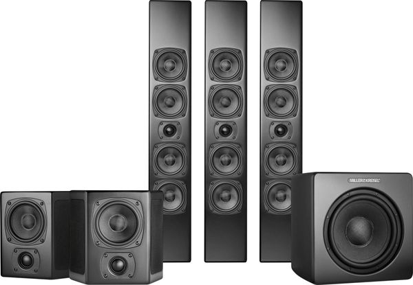 Le pack d'enceintes home-cinéma M&K Sound M90 5.1 se compose de trois enceintes murales M&K Sound M90 pour les voies frontales et la centrale, ainsi qu'une paire d'enceintes surround murales M&K Sound M40T et d'un caisson de basses M&K Sound V10 Plus.