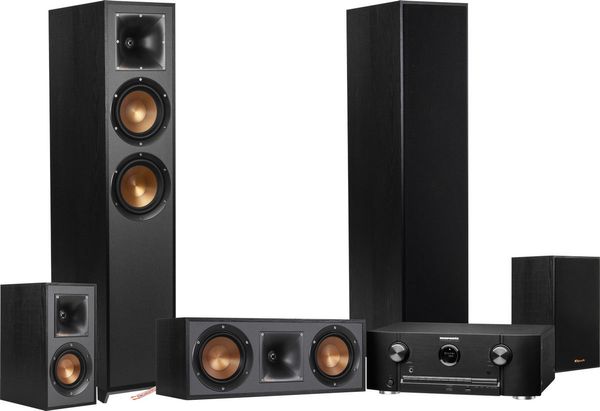 Ce système home-cinéma se compose de l'amplificateur home-cinéma 7.2 Marantz SR-5014, de la paire d'enceintes compactes Klipsch R-41M, de la paire d'enceintes colonne Klipsch R-620F, de l'enceinte centrale Klipsch R-52C et de 25 m de câble d'enceintes NorStone CL250 Classic.