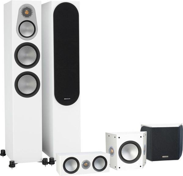 Le pack d'enceintes home-cinéma Monitor Audio Silver 300 HC 5.0 comprend une paire d'enceintes colonne Monitor Audio Silver 300, une paire d'enceintes surround Monitor Audio Silver FX et une enceinte centrale Monitor Audio Silver C150.