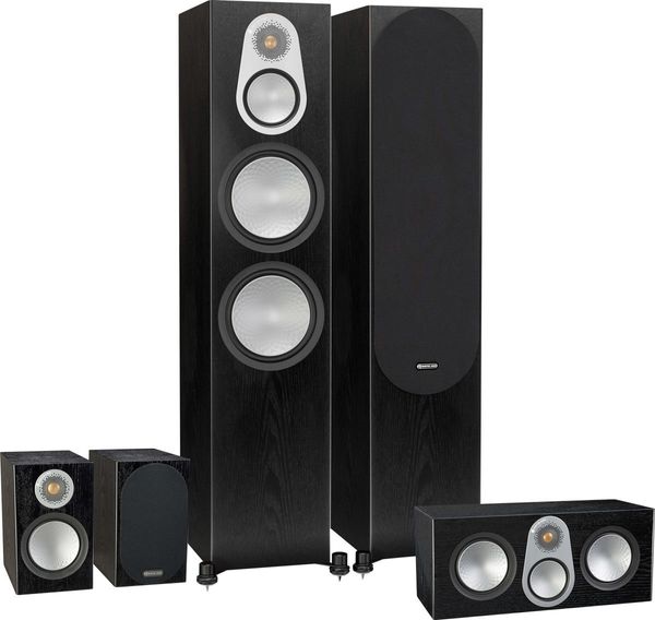 Le pack d'enceintes home-cinéma Monitor Audio Silver 500 HC 5.0 comprend une paire d'enceintes colonne Monitor Audio Silver 500, une paire d'enceintes compactes Monitor Audio Silver 50 utilisées comme enceintes surround et une enceinte centrale Monitor Audio Silver C350.