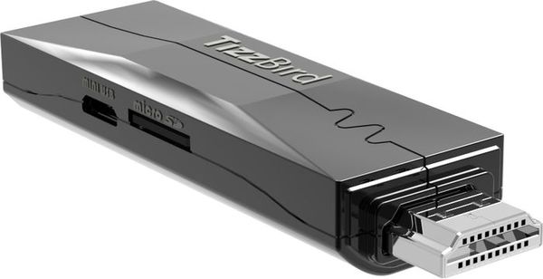 Le lecteur multimédia HDMI TizzBird TizzStick N1 est un modèle ultra-compact capable de lire des vidéos HD depuis un disque dur ou une clé USB externes. Tizzbird, habitué des coups d'éclats, propose un lecteur réseau multimédia complet au format ultra-compact. C'est bien simple, il n'est pas plus gros qu'une clé USB classique. Fonctionnant sous Android 4.0, le Tizzbird TizzStick N1 dispose d'une prise mini-USB, d'un port USB maître, d'un lecteur micro-SD et intègre un contrôleur WiFi 802.11n. De cette manière, le lecteur peut accéder à Internet et permet une navigation simple sur les sites de son choix. Plusieurs applications sont préinstallées, telles que Facebook, Skype ou Twitter par exemple. Il est même possible de jouer à Angry Birds. Le processeur permet le décodage des vidéos au format 1080p depuis un disque dur USB externe. Notez cependant que la lecture de tels fichiers via la connexion WiFi n'est pas recommandée et que la bande passante est optimisée pour la lecture des fichiers SD tels que les DivX. Enfin, le Tizzbird TizzStick N1 est équipé d'un scaler et peut délivrer une image 1080p au travers de sa sortie HDMI, quel que soit le format du fichier visionné.