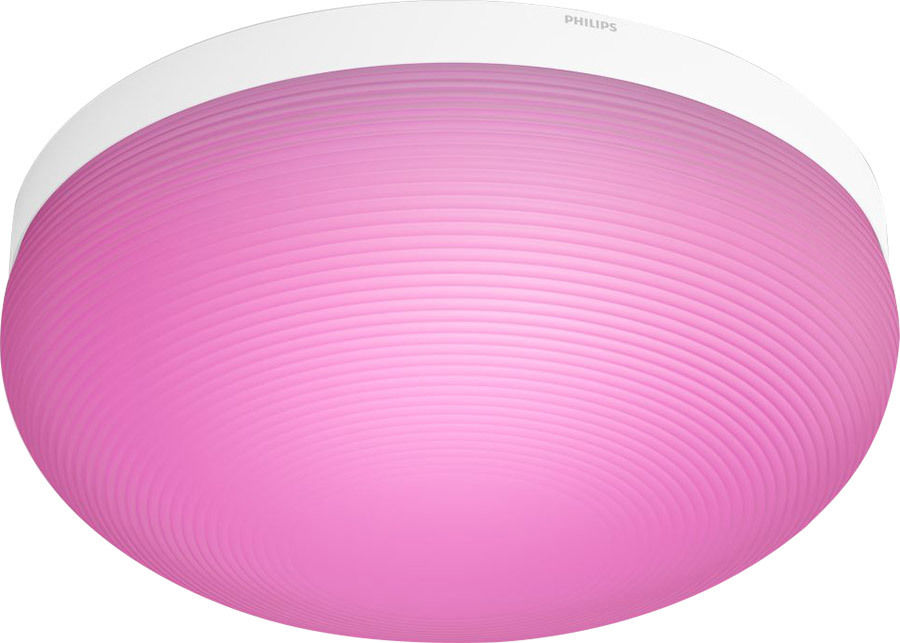 Le plafonnier connecté Philips Hue Flourish peut être paramétré pour produire une lumière blanche chaude ou froide ou bien colorée, pour créer l'ambiance lumineuse qui vous convient.