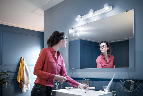 Le spot LED Philips Hue White Ambiance Adore 3 Spots diffuse une lumière blanche grâce à ses ampoules à LED intégrées dont la durée de vie est estimée à environ 15000 heures. La luminosité maximale atteint 350 lumens avec chaque ampoule fournie (1050 lm au total) pour une puissance unitaire consommée de 5 watts (15 watts au total). Grâce à l'application, il est possible d'adapter l'éclairage à différentes situations : lumière douce pour lire dans le bain, lumière du jour blanche et froide pour faire le plein d'énergie...
