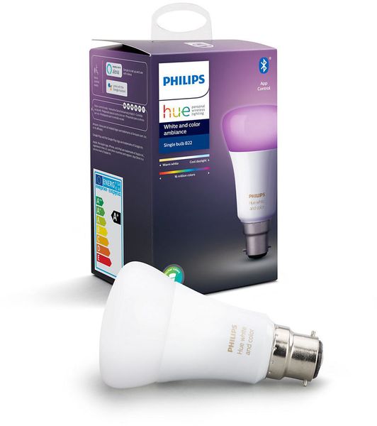 L'ampoule connectée Philips Hue White and Color B22 Bluetooth diffuse 16 millions de couleurs ainsi qu'une lumière blanche chaude ou froide avec une luminosité maximale de 806 lumens. Grâce à l'application Hue Bluetooth, vous pouvez contrôler directement jusqu'à 10 ampoules Philips Hue depuis votre tablette ou smartphone ! L'association avec le pont connecté Philips Hue Bridge (vendu séparément) permet de créer un éclairage connecté pour toute la maison en assurant le contrôle de 50 ampoules ou dispositifs compatibles Philips Hue.