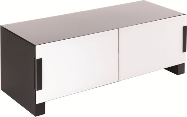 Au total, ce meuble peut accueillir 60 kg d'appareils électroniques. Ses flancs en bois satiné et ses plateaux et portes en verre trempé lui donnent un aspect élégant, tout en dissimulant une solide structure en acier laqué et grainé. Le plateau supérieur est d'une épaisseur de 8 mm alors que le plateau inférieur a une épaisseur de 6 mm. Pratique, le dos est aimanté et amovible, pour accéder à la connectique des appareils électroniques.