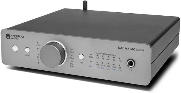 Le DAC Cambridge DacMagic 200M est un modèle polyvalent faisant à la fois office de DAC et d'ampli casque. Il succède au Cambridge DacMagic 100 auquel il apporte un double DAC ESS Sabre compatible avec les flux PCM jusqu'en 32 bits / 768 kHz, le DSD512 et le MQA. Sa connectique complète se compose d'entrées coaxiales, optiques, USB-B, ainsi que de sorties RCA et XLR. La sortie jack 6,35 mm est associée à une section d'amplification en classe AB assurant la prise en charge de la majorité des casques et écouteurs du marché. Enfin, un récepteur Bluetooth aptX facilite la diffusion des musiques à partir d'un smartphone ou d'une tablette.