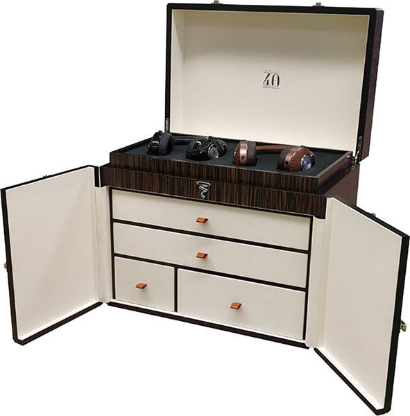 L'ensemble Focal Symphonie 40th est présenté et rangé dans une très belle malle plaquée en bois d'ébène de Macassar dont l'intérieur est couvert de microfibre beige. Les fermoirs et les poignées latérales sont réalisées en métal. Chaque malle est numérotée.