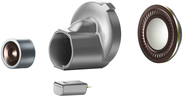 Les écouteurs intra-auriculaires Sony IER-Z1R sont équipés de trois transducteurs : un diaphragme de 12 mm de diamètre (à droite), un transducteur à armature équilibrée (en bas eu centre) et un super tweeter (à gauche).