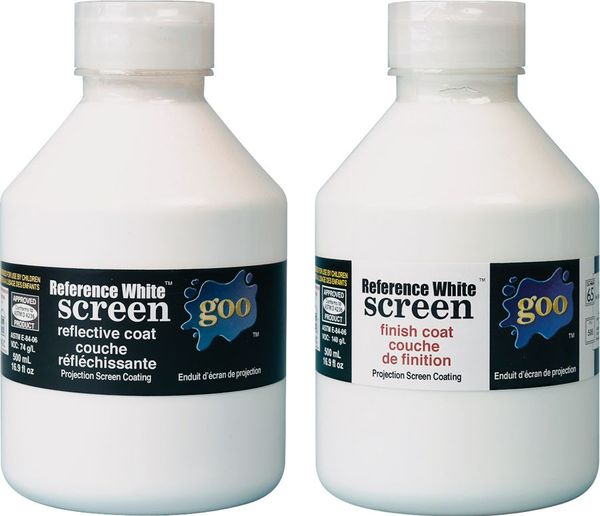Le kit de peintures Goo Kit Reference White Reflective et Finish Coat permet de traiter un mur ou une toile pour la projection d'images. Il ne s'agit donc pas d'une simple peinture blanche, mais bien de revêtements spécialement conçus et développés pour répondre à des exigences colorimétriques et de diffusion angulaire très élevées. Très mattes et réflectives, les peintures Goo sont garanties sans plomb, résistent aux UV et au jaunissement. Leur base acrylique est de très haute  qualité. Le kit Reference White Reflective et Finish Coat est composé d'une bouteille de peinture réflective, à appliquer en premier lieu, ainsi que d'un flacon de peinture de finition. L'addition de ces deux couches à appliquer successivement donne à la surface peinte des propriétés mécaniques idéales pour la projection d'images. L'application peut être réalisée au rouleur ou bien au pistolet à peinture.