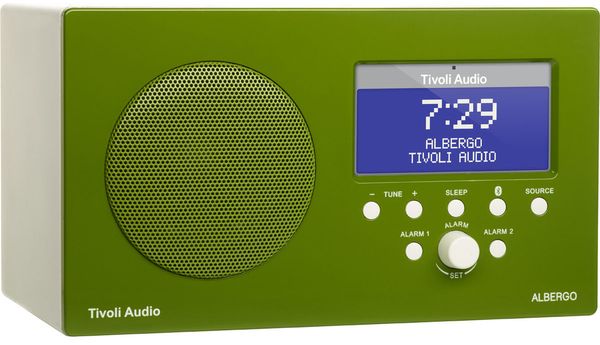 Ce qui séduit d'emblée avec le radio-réveil Tivoli Albergo, c'est son design simple et sa finition très soignée. Les lignes sont sobres et permettent d'envisager une intégration dans tous les types d'intérieurs. En façade, on trouve un haut-parleur large bande de 3 pouces (7,62 cm) abrité derrière une grille métallique. Il bénéficie d'une charge bass-reflex pour augmenter sa portée dans les basses fréquences, avec un évent placé sur la face arrière de l'appareil. À droite du haut-parleur se trouve un grand écran LCD rétro-éclairé particulièrement lisible. La luminosité du rétro-éclairage est ajustable, offrant ainsi un grand confort d'utilisation au quotidien. L'écran du radio-réveil Tivoli Albergo indique l'heure dans sa partie supérieure. Les deux lignes inférieures permettent d'afficher le nom de la station de radio reçue ainsi que les informations RDS pour la bande FM.