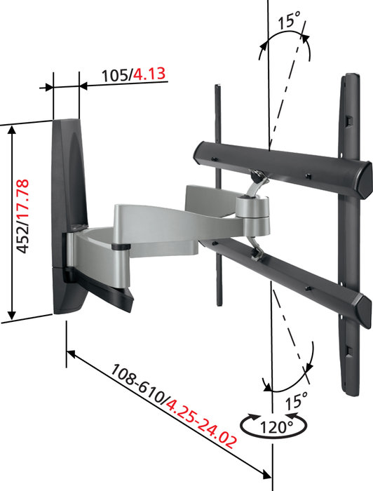 Le support mural pour téléviseur LED ou plasma Vogels EFW-6445 est compatible avec les modèles d'une diagonale comprise entre 102 et 203 cm, dans la limite de 55 kg. Il permet d'orienter très confortablement avec une seule main votre téléviseur, sur une amplitude horizontale de 120 degrés de gauche à droite. Grâce au support Vogels EFW-6445, l'écran peut se décoller du mur pour être ainsi plus proche du spectateur. Il est conçu pour que le téléviseur ne puisse jamais entrer en contact avec le mur.
