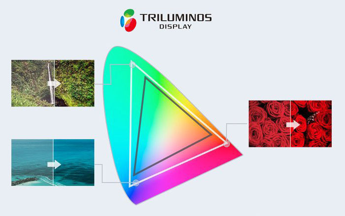 La dalle du téléviseur UHD-4K Sony KD-75XE9005B bénéficie de la technologie exclusive Triluminos de Sony. Introduite en 2013 par le constructeur, cette technologie offre un espace de couleur plus étendu que celui d'un téléviseur conventionnel.